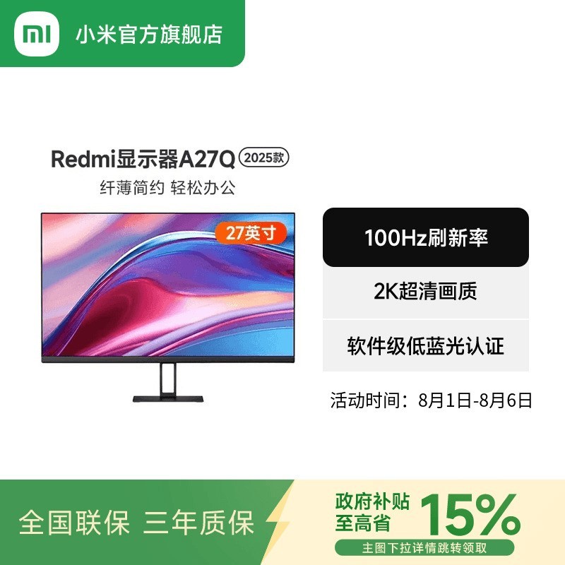 红米REDMI A27Q 2025款27英寸IPS显示器,现在促销火热进行中,使用国家补贴8.5折起,直降103.35元,最终仅需585.65元即可入手,性价比爆棚不容错过。这款显示器搭载了IPS技术硬屏,具备超窄边框设计和高达90%的屏占比,提供2560×1440高清分辨率与100Hz刷新率,无论是办公还是游戏都能带来流畅体验,有效减少拖影与卡顿现象。支持178°广视角和1670万色丰富色彩呈现,每台出厂前均经过专业校色处理,△E<2确保色彩精准还原,并具备95% DCI-P3广色域覆盖。通过德国莱茵TUV软件级低蓝光认证,配合DC调光有效减少屏幕闪烁,长时间使用更护眼。接口方面配备DP1.4、HDMI以及3.5mm耳机孔,支持VESA壁挂安装,满足多样连接需求。更享3年原厂整机保修及上门售后服务,品质无忧,喜爱的朋友千万不要错过这次超值机会,赶紧入手吧。