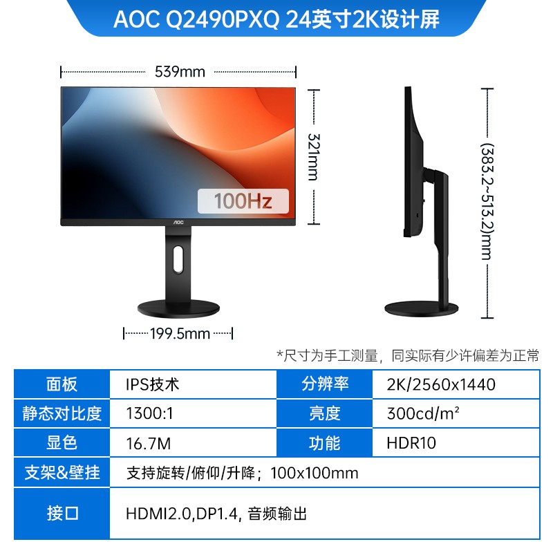 AOC Q2490PXQ 23.8英寸显示器,作为AOC 2017年推出的精品,凭借其出色的显色效果和多功能设计,深受广大用户喜爱。这款显示器采用IPS面板,分辨率高达2560×1440,呈现细腻逼真的画质,拥有1670万色显示,色准出色,dE<2,色彩还原更真实,特别适合设计、绘图和摄影后期处理。屏幕具备1.5mm超窄边框设计,带来更宽广的视野体验。5ms灰阶响应时间和250cd/m²亮度,配合滤蓝光不闪屏技术,无论是长时间办公还是游戏娱乐,都能有效缓解视觉疲劳。接口方面配备DP、HDMI、VGA,满足多设备连接需求。底座支持升降旋转,灵活适配不同使用场景,也支持100×100 VESA壁挂,节省空间更便捷。