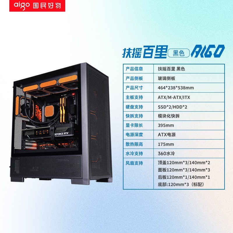 爱国者扶摇千里贰号黑色玻璃侧透台式机电脑主机箱,外观时尚兼具实用性,支持360水冷、ATX主板及五面网孔散热设计,有效提升整机散热效率,保障硬件稳定运行。机箱预装3只风扇,优化风道布局,降低噪音更静音舒适。
