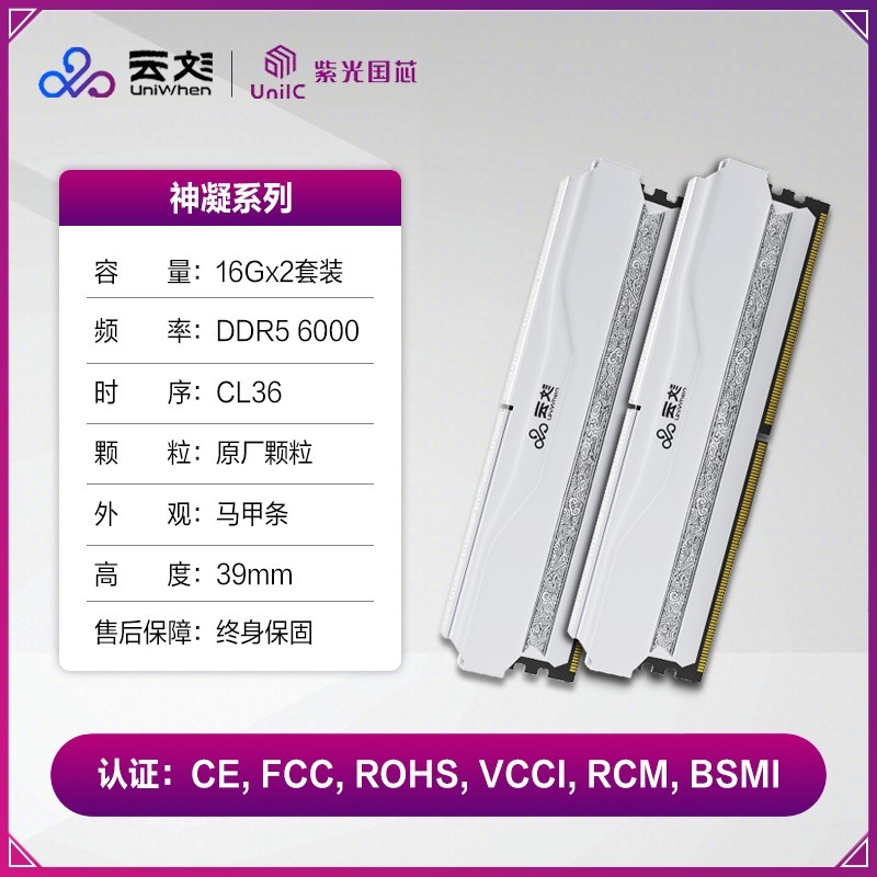 云彣紫光国芯推出的这款32G 16Gx2 DDR5 6000 6400 C28台式机超频马甲内存条,颜色分类有神凝6000/C36 32G(16Gx2)。它能满足台式机的使用需求,具备超频功能,马甲设计也有助于散热。