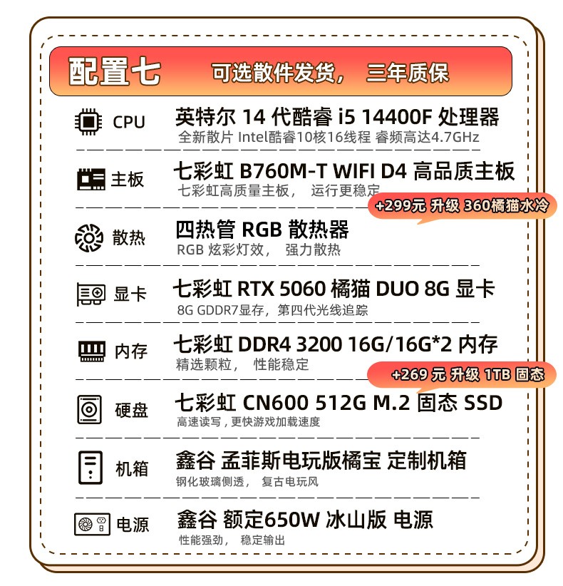 七彩虹COLORFUL橘猫主机是一款适合游戏玩家的组装台式机整机,它可搭配i5 14400f、14600kf、14700f等处理器,显卡方面有4060、5060ti、5070、5060等多种选择,满足不同用户的性能需求。在天猫精选,这款主机目前活动售价5299元,参与立减109元、补贴10%起减499元优惠活动,还能用淘金币抵扣200元,下单1件,实付低至4491.02元。