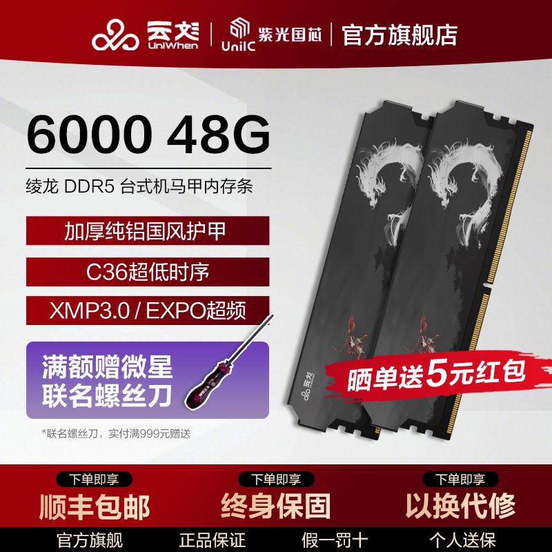 云彣UniWhen紫光国芯的这款48G套条24Gx2内存条,采用DDR5 6000规格,专为台式机打造,是超频马甲内存。