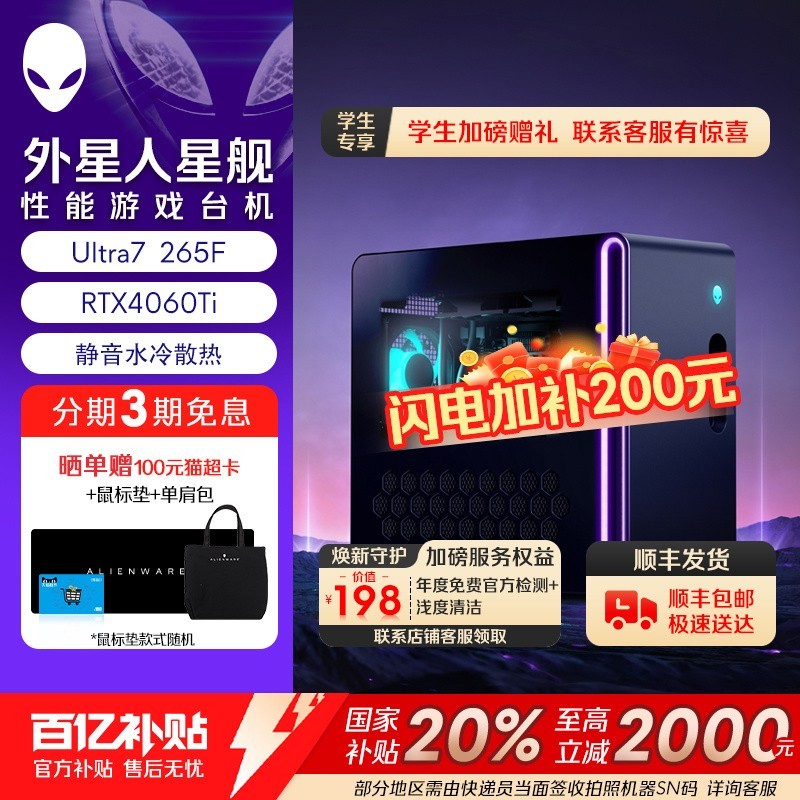 外星人星舰R17高端游戏电脑主机搭载Ultra7处理器,性能强劲稳定,轻松应对各类大型游戏与多任务处理,配备16GB内存+1TB硬盘+RTX4060Ti独立显卡,图形渲染更快更细腻,带来沉浸式游戏体验,外观设计科幻感十足,散热表现优秀,满足长时间高负载运行需求,目前在天猫商城官方标配套餐限时促销,原价13999元,现参加百亿补贴后仅需11999元即可入手,使用国家补贴再减2000元,性价比大幅提升,追求极致性能的玩家不容错过。