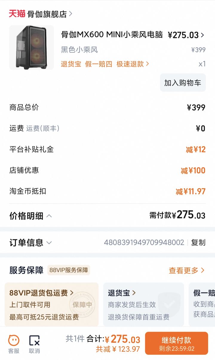 目前该款机箱在天猫精选活动售价399元,参与立减100元优惠后实付低至299元,还可叠加淘金币抵扣,最终到手价仅275.03元,性价比出众,是打造高颜值小型主机的理想之选。