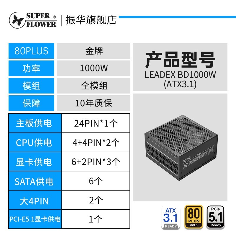 振华电源LEADEX BD1000W专为电脑台式机主机机箱打造,符合atx3.1标准,是金牌全模组电源。它能为电脑提供稳定且强劲的电力支持,全模组设计让用户可以根据自身需求灵活搭配电源线材,有效提升机箱内部的整洁度和散热效率。