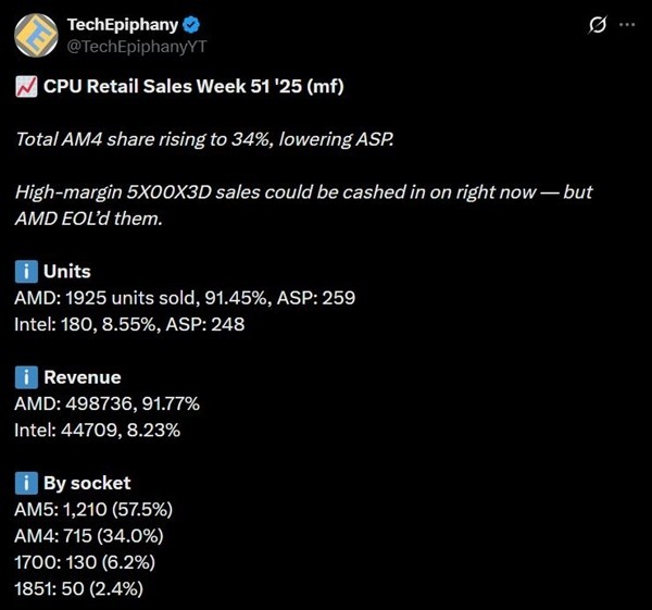 这一消费转向直接带动了AMD AM4老平台的市场需求。来自德国主要零售商的销售数据显示,AM4接口处理器的销量近期迅速上升。过去两周内,其销量占比从24%跃升至34%,几乎占据整体CPU销量的三分之一。与此同时,原本占据市场主导地位的AM5平台处理器销量份额则从70%下滑至不足60%,呈现出明显的此消彼长态势。