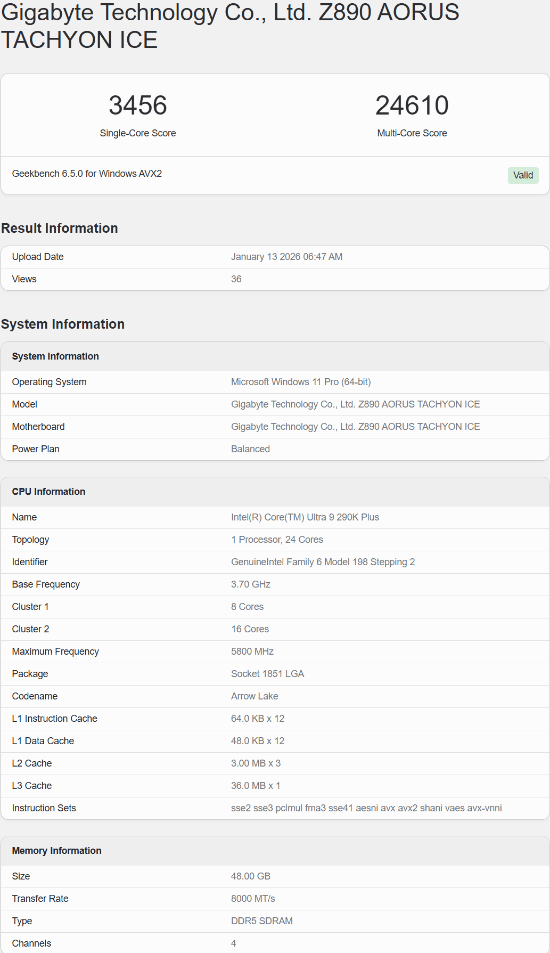 测试数据显示,这款处理器的基础频率为3.70GHz,最大睿频同样为5.80GHz,在实际负载中展现出更高的频率上限。在基准性能评估中,其单线程得分为3456分,多线程总分达到24610分。相比Ultra 9 285K,单核性能提升约7%,多核性能提升达9%。