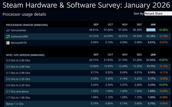 2026年2月5日消息,在桌面处理器市场,AMD自锐龙架构推出以来持续扩大份额,整体已接近与Intel形成均势。然而最新一期Steam硬件调查数据显示,Intel的CPU占有率出现止跌回升迹象。
