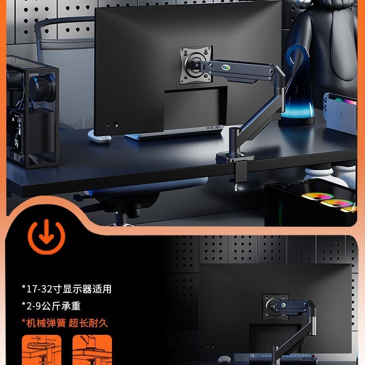 这款显示器支架是倒挂升降式的,具备vesa增高功能,可作为显示屏幕底座,其悬臂设计让它成为台式电脑的实用配件。它采用机械臂设计,能灵活调整显示器的位置和角度。