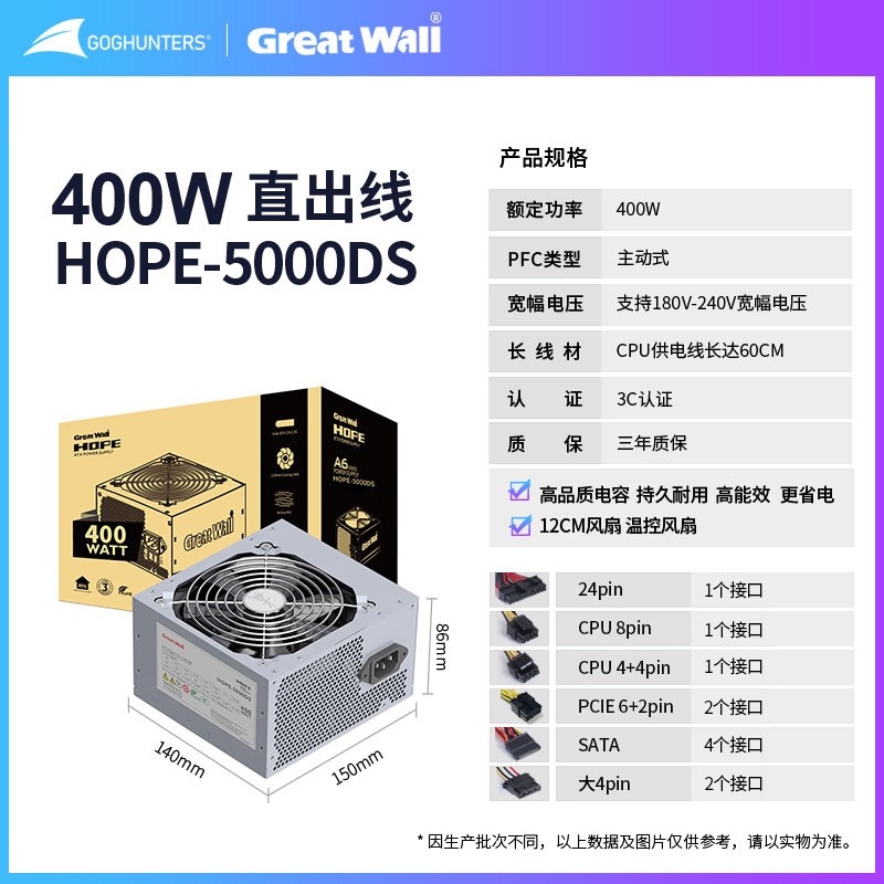 GOGHUNTERS长城电源,有HOPE6000DS、5000DS等型号,提供额定400W、500W、600W、700W多种功率选择,适用于台式主机电脑。这款电源能为电脑稳定供电,保障主机正常运行。