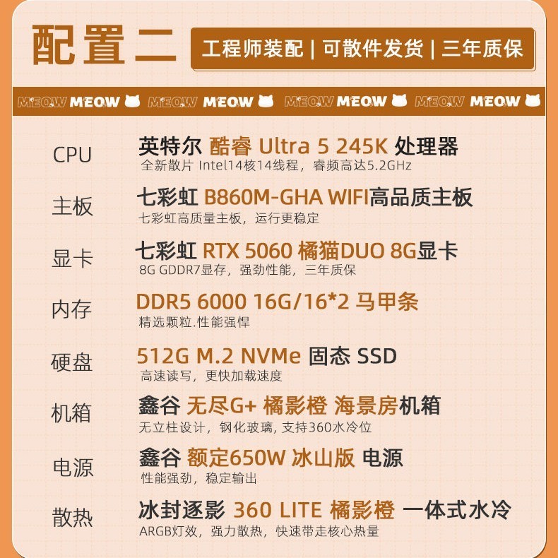 天猫精选正在热卖七彩虹橘猫主机245K Ultra 7 265K,这是一款精心组装的台式机整机。它可选RTX5060ti 8g、RTX4060、RTX5070等不同显卡,能满足不同用户对于图形处理和游戏体验的需求,适合游戏玩家、设计师等人群使用。